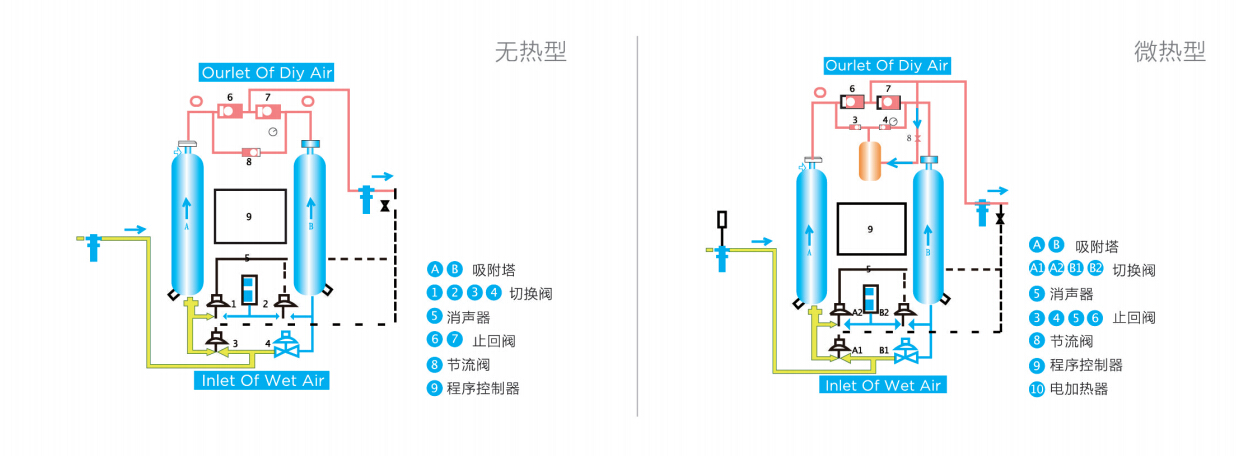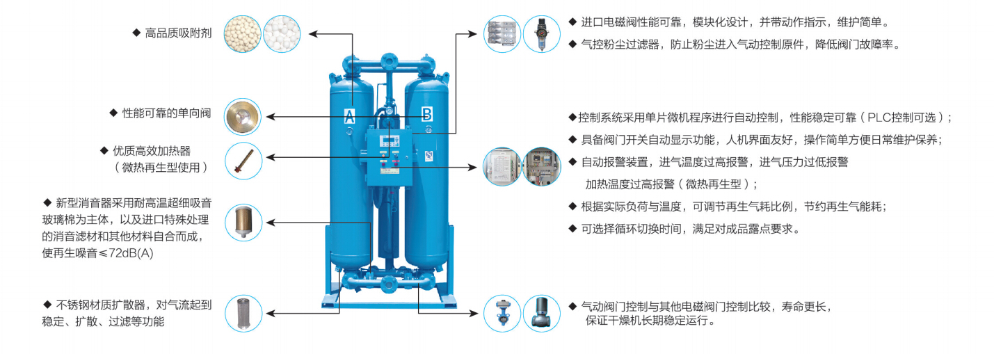 微热型再生吸附式压缩空气干燥器集热吹扫和无热吹扫的有点于一身,对吹扫型空气进行加热处理,降低其消耗。有效地避免了压缩空气干燥器切换时间短、吹扫空气消耗量大、存在热电浪费的缺点。该产品切换时间合理,净化空气消耗少,是最经济的吸附式干燥机。
